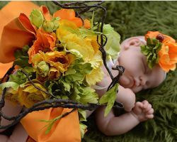 話題のニューボーンフォトにもピッタリの赤ちゃんコサージュをご用意しました。お宮参りやお出かけが華やかになるお花です。コサージュはママのバッグにつけたり、お子様のコサージュにもなるように作られています。